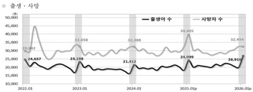 출생 증가에도 인구 75개월째 감소…인구이동은 11% 급감 출생아 수 증가에도 사망자 수가 더 크게 늘면서 인구 감소가 75개월째 이어졌다. 저출산이 일부 완화되고 있지만 고령화 영향이 더 크게 작용한 것으로 풀이된다. 25일 국가데이터처의 '2026년 1월 인구동향'에 따르면 지난 1월 출생아 수는 2만6916명으로 전년 동월 대비 2817명 늘었다. 여성 1명이 평생 낳을 것으로 예상되는 합계출산율은 1년 전보다 0.10명 늘어난 0.99명으로 집계됐다. 출산 순위별 출생아수 구성비는 첫째아(63.5%) 기준 전년 동월 대비 1.4%포인트 올랐다. 둘째아는 30.5%, 셋째아 2026-03-25 12:00:00 -
