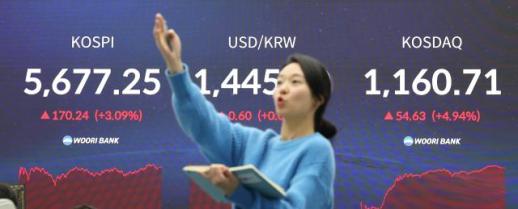 설 연휴 이후 코스피가 사상 처음으로 5600선을 넘어선 채 거래를 마친 19일 서울 중구 우리은행 딜링룸에서 딜러들이 업무를 보고 있다.