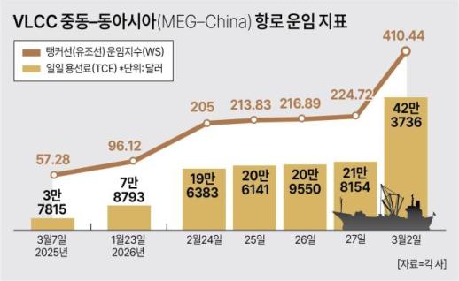 [단독] 유조선 용선료 하루 40만 달러 돌파…이란 전쟁 이후 두 배 올랐다