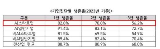 보고서에 따르면 지난 2023년 기준 국내AI 스타트업 3년 생존율은 56.2%로 나타났다. 이는 AI 일반기업(72.7%)이나 전산업 평균(68.8%)