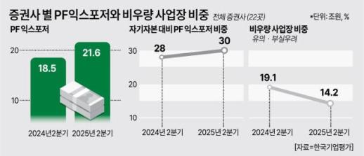 '부동산의 덫'에서 벗어나는 증권사들…불씨는 여전 증권업계가 ‘부동산 프로젝트파이낸싱(PF)의 덫’에서 벗어나고 있다. 대형사를 중심으로 신규 사업장에 대한 질적 개선이 이뤄지면서 전반적인 부실 위험이 완화된 것으로 나타났다. 다만 중소형사는 리스크 해결이 지연되면서 건전성 개선이 더딘 상황이다. 29일 한국기업평가가 신용도를 평가하는 증권사 22곳을 대상으로 PF 리스크를 분석한 결과 올해 6월 말 기준 증권사들의 PF 익스포저는 21조6000억원으로 집계됐다. 이는 1년 전(18조5000억원)보다 3조1000억원 늘어난 수치다. 자기자본 대비 부동 2025-09-29 18:18:24