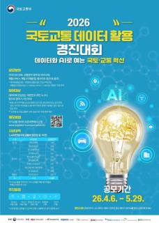 국토부, 데이터·AI 결합 아이디어 경진대회… 상금 3400만원 국토교통부가 국토·교통 데이터와 인공지능 기술을 접목한 아이디어를 발굴하기 위해 6일부터 ‘2026 국토·교통 데이터 활용 경진대회’를 연다고 5일 밝혔다. 이번 대회는 데이터 활용을 넓히고 창업으로 이어질 수 있는 서비스 발굴에 초점을 맞췄다. 총상금은 3400만원 규모로 책정했다. 대회 주제는 ‘데이터와 AI로 여는 국토교통 혁신’이다. 분야는 정책·창업 아이디어와 제품·서비스 개발로 나눠 진행한다. 참가는 대한민국 국민이면 누구나 할 수 있다 2026-04-05 11:07:33 -