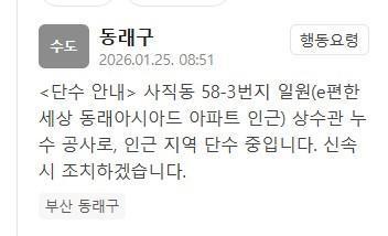 부산 동래구 사직동 단수…"상수관 누수 공사" 부산광역시 동래구 사직동 일대가 단수 중이다. 25일 동래구는 안전재난문자를 통해 "이날 사직동 58-3번지 일원 상수관 누수 공사로, 인근 지역 단수 중"이라며 "신속시 조치하겠다"고 밝혔다. 2026-01-25 09:03:07