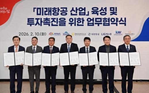 천수만에서 날아오른다…대한민국 'K-미래항공' 전진기지 태안 대한민국 미래항공산업의 새로운 심장으로 도약을 준비 중인 충남 태안 천수만에 국내를 대표하는 항공·방산기업들이 힘을 보탰다. 충남도는 10일 태안문화예술회관에서 김태흠 충남지사와 성일종 국회의원, 이정석 국방과학연구소 부소장, 대한항공·LIG넥스원·한국항공우주산업(KAI)·한화에어로스페이스 등 4개 기업 관계자가 참석한 가운데 ‘미래항공산업 육성 및 투자 촉진을 위한 업무협약(MOU)’을 체결했다. 이번 협약은 태안 천수만 B지구 일원에 건립을 추진 중인 국 2026-02-10 17:43:20 -