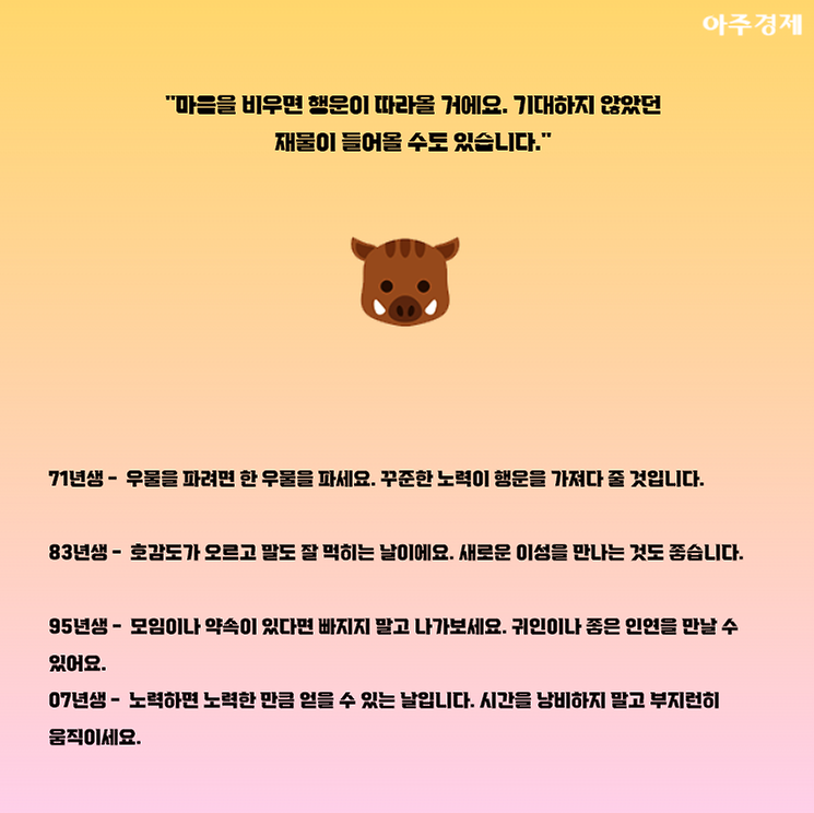 ▶돼지띠 오늘의 운세 "마음을 비우면 행운이 따라올 거에요. 기대하지 않았던 재물이 들어올 수도 있습니다."