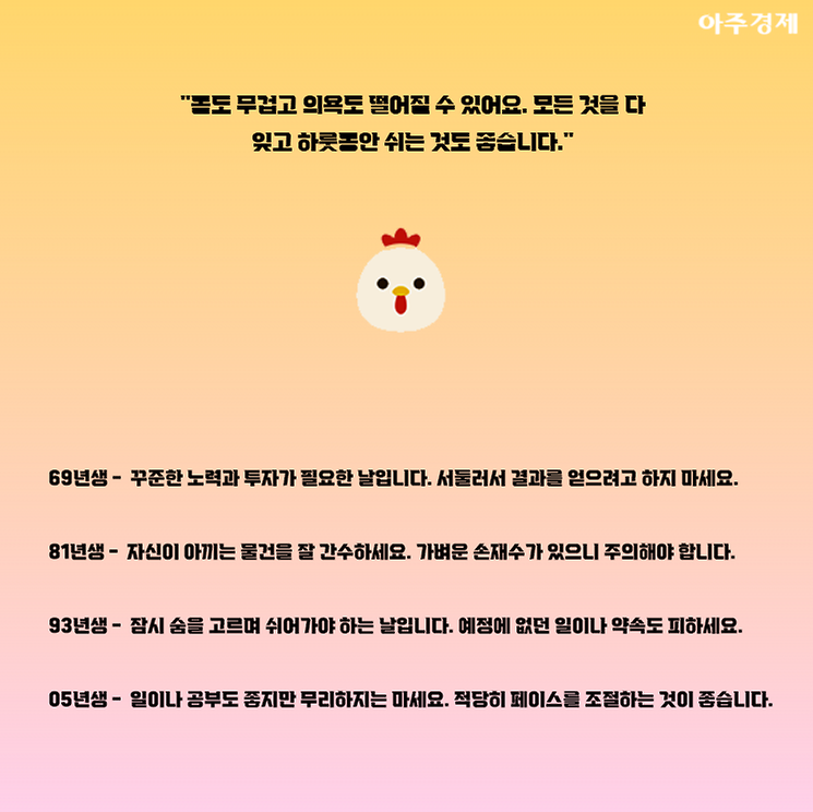 ▶닭띠 오늘의 운세 "몸도 무겁고 의욕도 떨어질 수 있어요. 모든 것을 다 잊고 하룻동안 쉬는 것도 좋습니다."