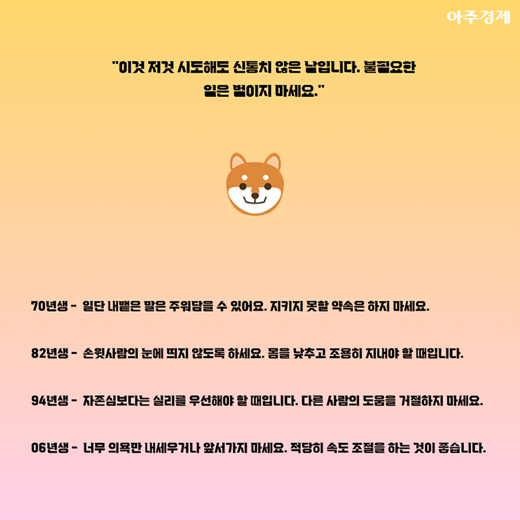 ▶개띠 오늘의 운세 "이것 저것 시도해도 신통치 않은 날입니다. 불필요한 일은 벌이지 마세요."