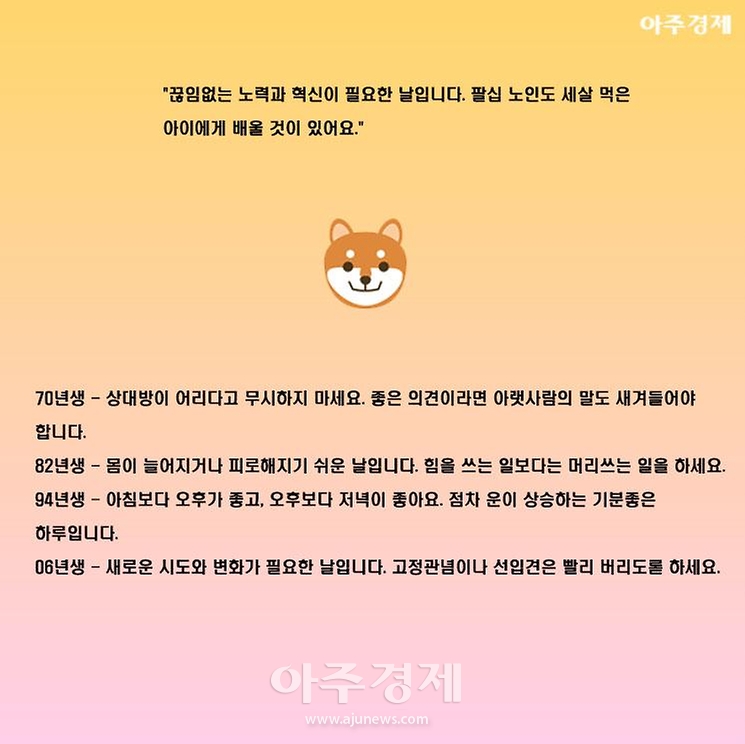 ▶개띠 오늘의 운세  "끊임없는 노력과 혁신이 필요한 날입니다. 팔십 노인도 세살 먹은 아이에게 배울 것이 있어요."