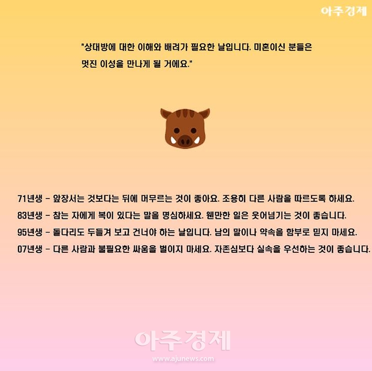 ▶돼지띠 오늘의 운세 "상대방에 대한 이해와 배려가 필요한 날입니다. 미혼이신 분들은 멋진 이성을 만나게 될 거에요."