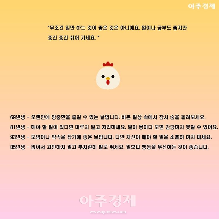 ▶닭띠 오늘의 운세 "무조건 일만 하는 것이 좋은 것은 아니에요. 일이나 공부도 좋지만 중간 중간 쉬어 가세요. "