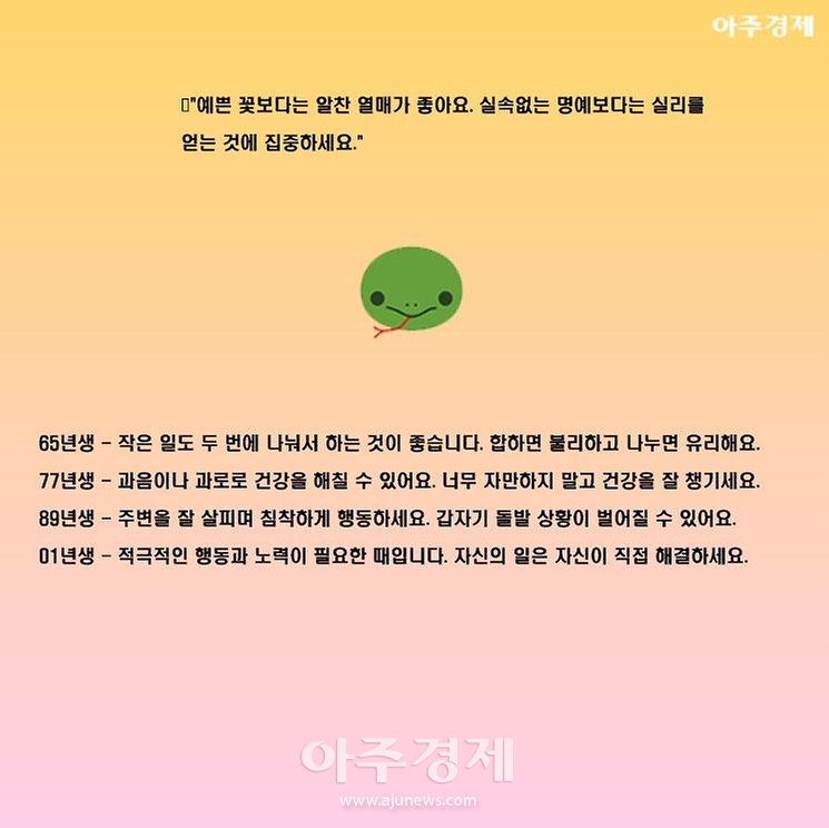 ▶뱀띠 오늘의 운세  "예쁜 꽃보다는 알찬 열매가 좋아요. 실속없는 명예보다는 실리를 얻는 것에 집중하세요."