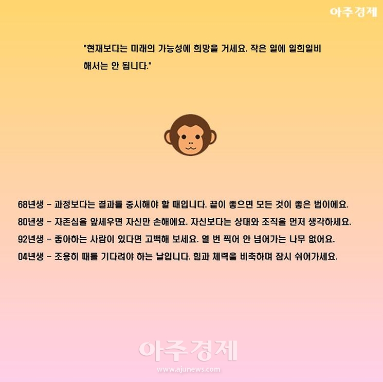 ▶원숭이띠 오늘의 운세 "현재보다는 미래의 가능성에 희망을 거세요. 작은 일에 일희일비 해서는 안 됩니다."