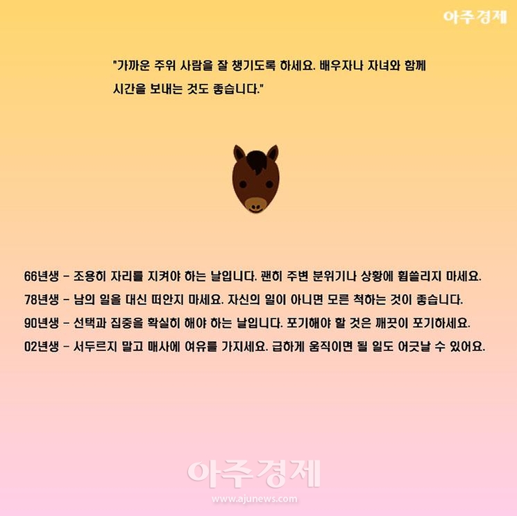 ▶말띠 오늘의 운세 "가까운 주위 사람을 잘 챙기도록 하세요. 배우자나 자녀와 함께 시간을 보내는 것도 좋습니다."