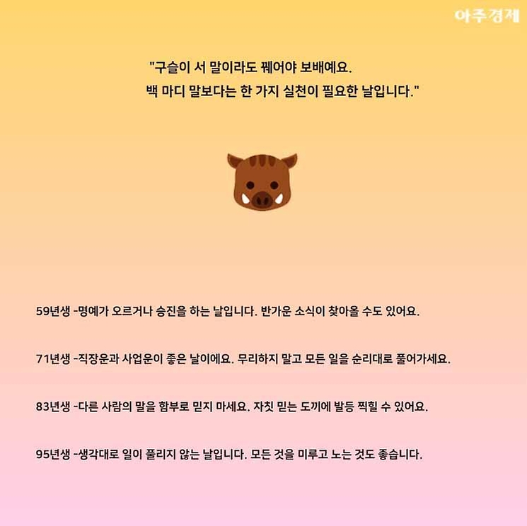 ▶돼지띠 오늘의 운세 "구슬이 서 말이라도 꿰어야 보배예요. 백 마디 말보다는 한 가지 실천이 필요한 날입니다."