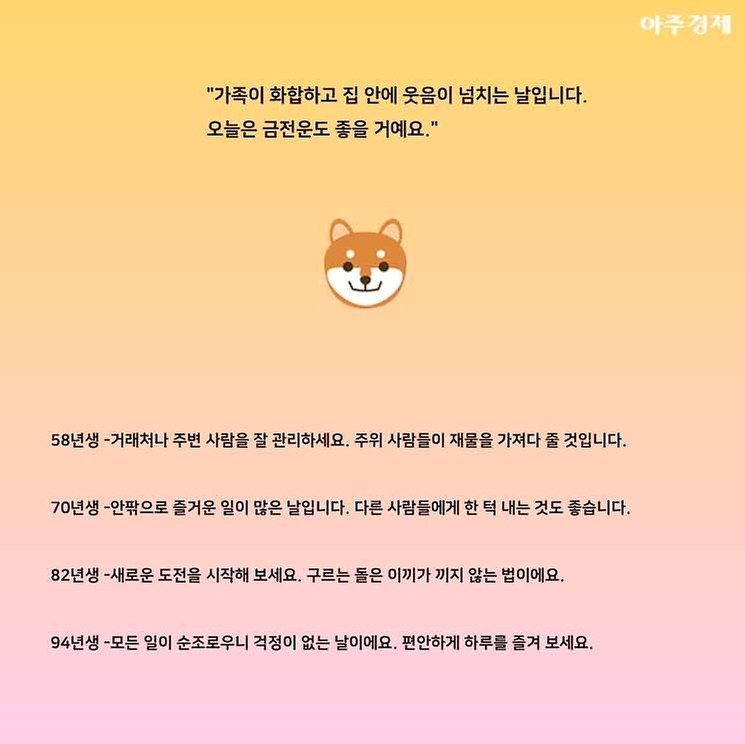 ▶개띠 오늘의 운세 "가족이 화합하고 집 안에 웃음이 넘치는 날입니다. 오늘은 금전운도 좋을 거예요."
