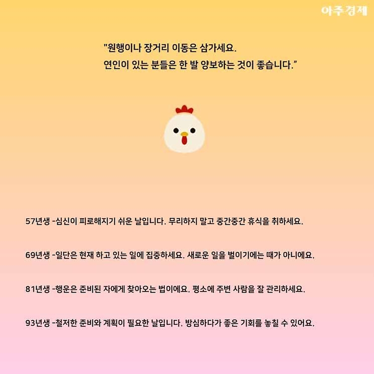 ▶닭띠 오늘의 운세 "원행이나 장거리 이동은 삼가세요. 연인이 있는 분들은 한 발 양보하는 것이 좋습니다."