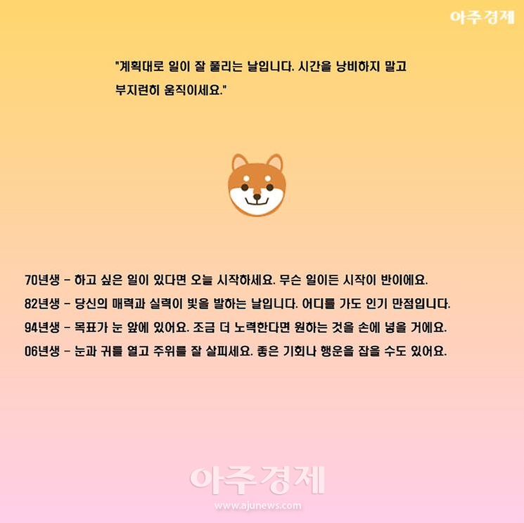 ▶개띠 오늘의 운세 "계획대로 일이 잘 풀리는 날입니다. 시간을 낭비하지 말고 부지런히 움직이세요."