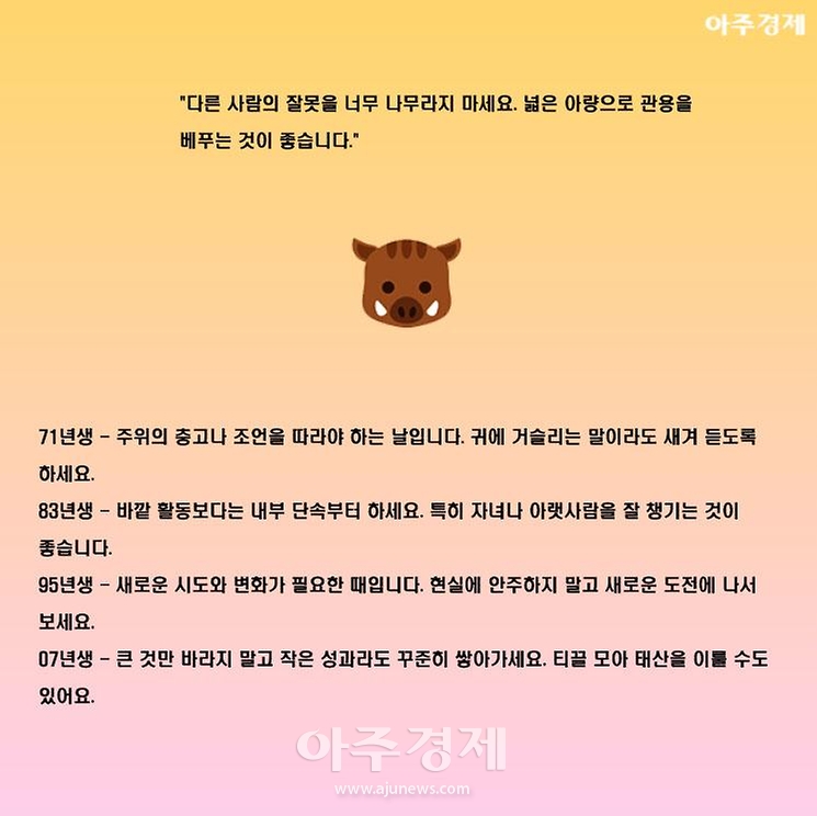 ▶돼지띠 오늘의 운세 "다른 사람의 잘못을 너무 나무라지 마세요. 넓은 아량으로 관용을 베푸는 것이 좋습니다."