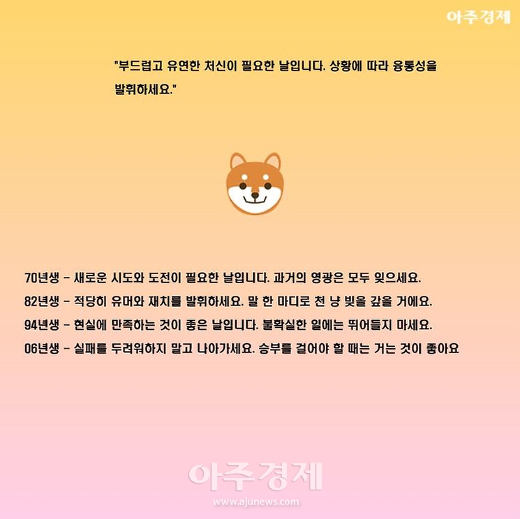 ▶개띠 오늘의 운세 "부드럽고 유연한 처신이 필요한 날입니다. 상황에 따라 융통성을 발휘하세요."