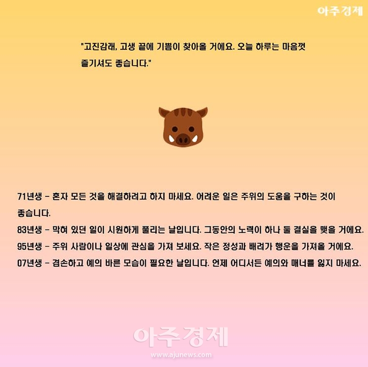 ▶돼지띠 오늘의 운세 "고진감래, 고생 끝에 기쁨이 찾아올 거에요. 오늘 하루는 마음껏 즐기셔도 좋습니다."