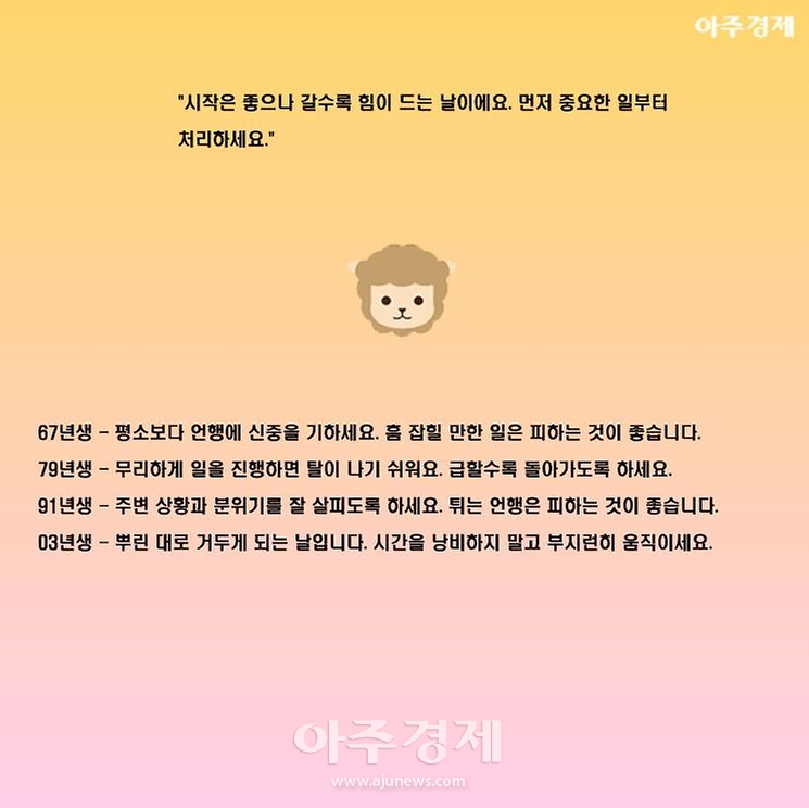 ▶양띠 오늘의 운세 "시작은 좋으나 갈수록 힘이 드는 날이에요. 먼저 중요한 일부터 처리하세요."