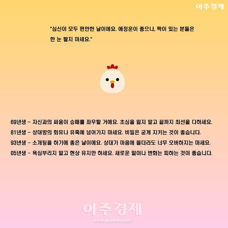 ▶닭띠 오늘의 운세 "심신이 모두 편안한 날이에요. 애정운이 좋으나, 짝이 있는 분들은 한 눈 팔지 마세요."