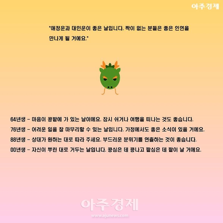 ▶용띠 오늘의 운세 "애정운과 대인운이 좋은 날입니다. 짝이 없는 분들은 좋은 인연을 만나게 될 거에요."