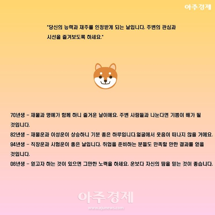 ▶개띠 오늘의 운세 "당신의 능력과 재주를 인정받게 되는 날입니다. 주변의 관심과 시선을 즐겨보도록 하세요."