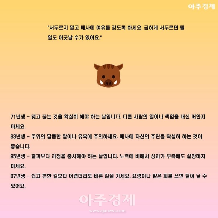 ▶돼지띠 오늘의 운세 "서두르지 말고 매사에 여유를 갖도록 하세요. 급하게 서두르면 될 일도 어긋날 수가 있어요."
