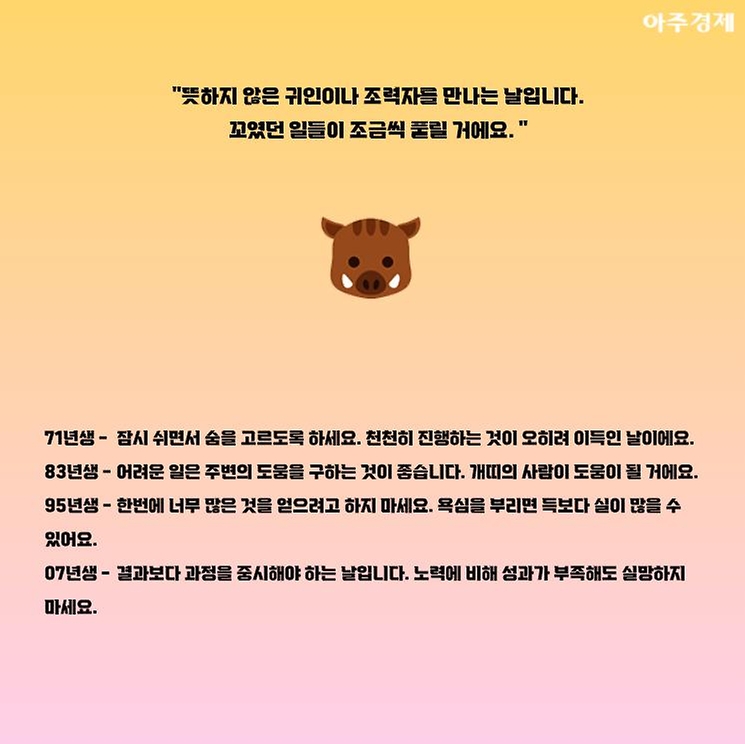 ▶돼지띠 오늘의 운세 "뜻하지 않은 귀인이나 조력자를 만나는 날입니다. 꼬였던 일들이 조금씩 풀릴 거에요. "
