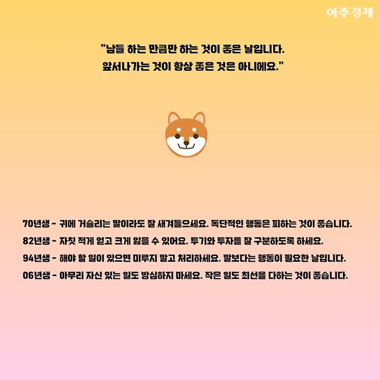 ▶개띠 오늘의 운세 "남들 하는 만큼만 하는 것이 좋은 날입니다. 앞서나가는 것이 항상 좋은 것은 아니에요."