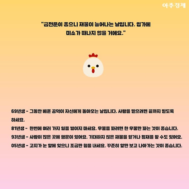 ▶닭띠 오늘의 운세 "금전운이 좋으니 재물이 늘어나는 날입니다. 입가에 미소가 떠나지 않을 거에요."