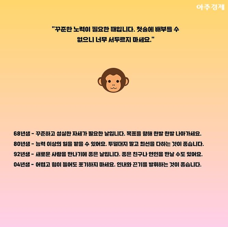 ▶원숭이띠 오늘의 운세 "꾸준한 노력이 필요한 때입니다. 첫술에 배부를 수 없으니 너무 서두르지 마세요."