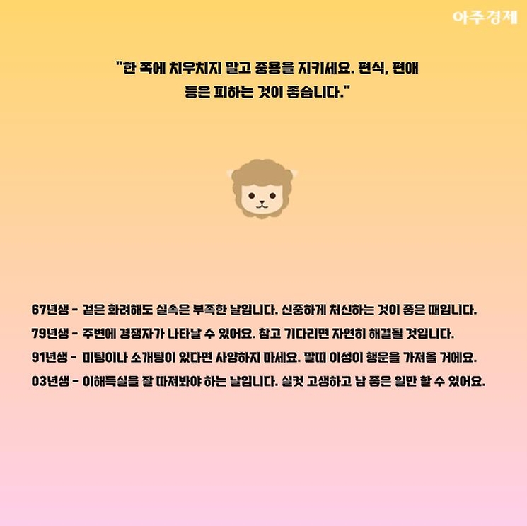 ▶양띠 오늘의 운세 "한 쪽에 치우치지 말고 중용을 지키세요. 편식, 편애 등은 피하는 것이 좋습니다."
