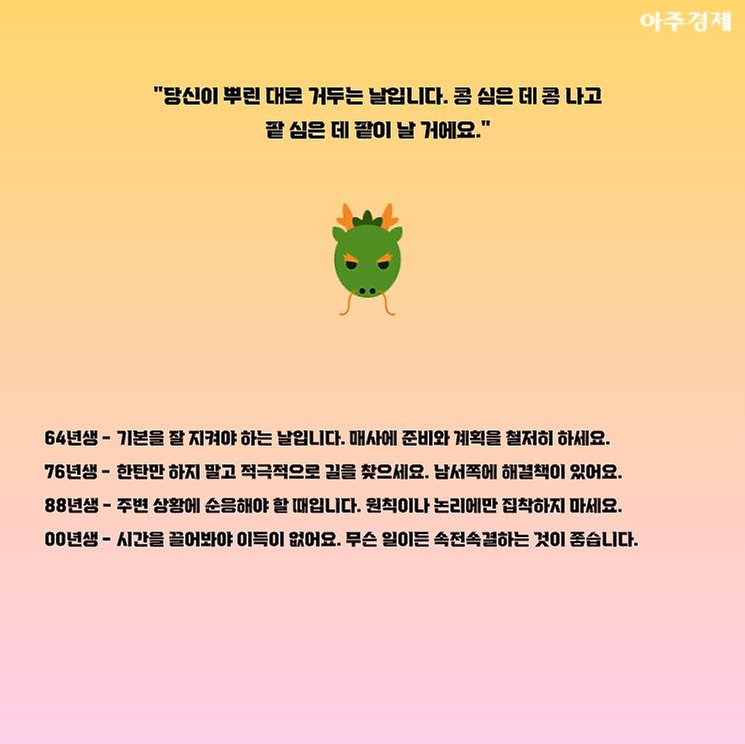 ▶용띠 오늘의 운세 "당신이 뿌린 대로 거두는 날입니다. 콩 심은 데 콩 나고 팥 심은 데 팥이 날 거에요."