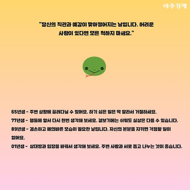 ▶뱀띠 오늘의 운세 "당신의 직관과 예감이 맞아떨어지는 날입니다. 어려운 사람이 있다면 모른 척하지 마세요."