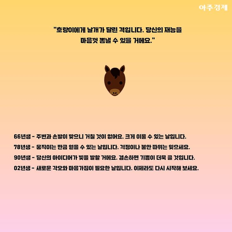 ▶말띠 오늘의 운세 "호랑이에게 날개가 달린 격입니다. 당신의 재능을 마음껏 뽐낼 수 있을 거에요."