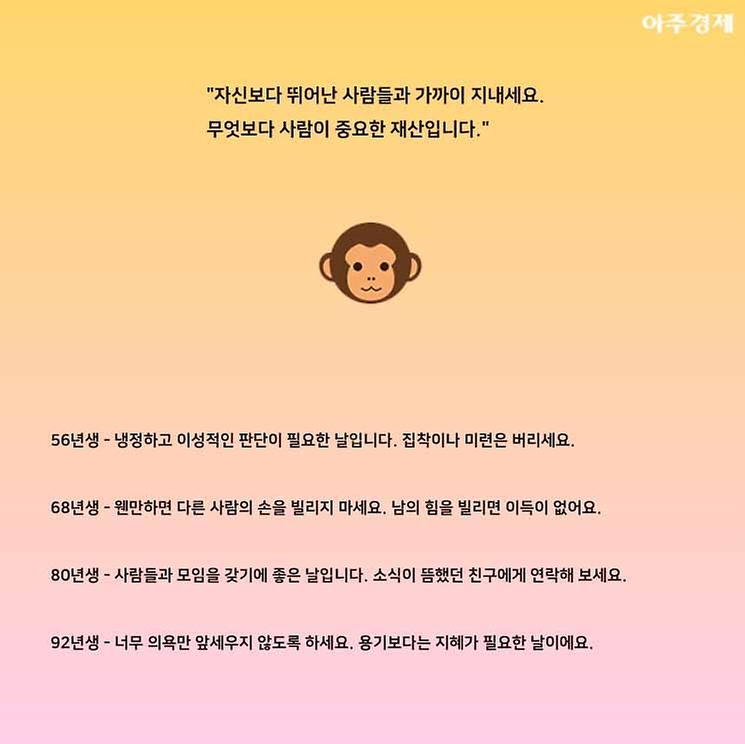 ▶원숭이띠 오늘의 운세 "자신보다 뛰어난 사람들과 가까이 지내세요. 무엇보다 사람이 중요한 재산입니다."