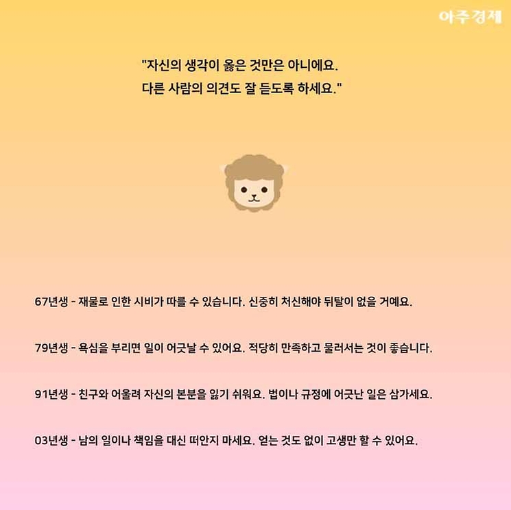 ▶양띠 오늘의 운세 "자신의 생각이 옳은 것만은 아니에요. 다른 사람의 의견도 잘 들어주도록 하세요."