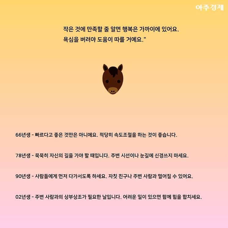 ▶말띠 오늘의 운세 "작은 것에 만족할 줄 알면 행복은 가까이에 있어요. 욕심을 버려야 도움이 따를 거에요."