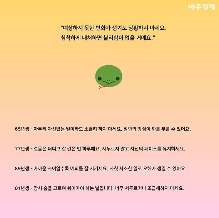 ▶뱀띠 오늘의 운세 "예상하지 못한 변화가 생겨도 당황하지 마세요. 침착하게 대처하면 불리함이 없을 거에요."