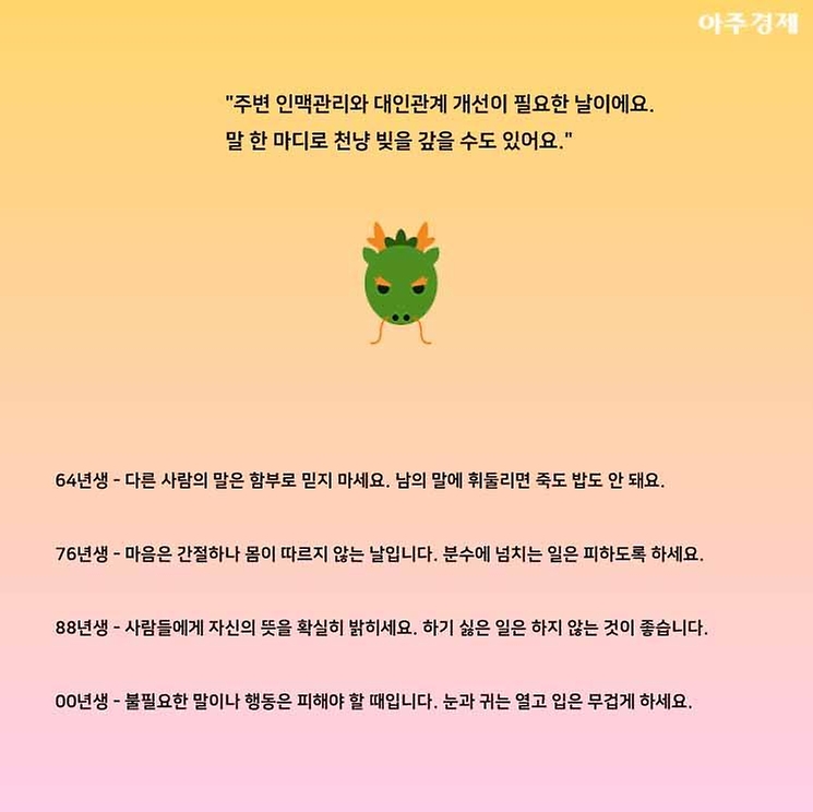 ▶용띠 오늘의 운세 "주변 인맥관리와 대인관계 개선이 필요한 날이에요. 말 한 마디로 천냥 빚을 갚을 수도 있어요."