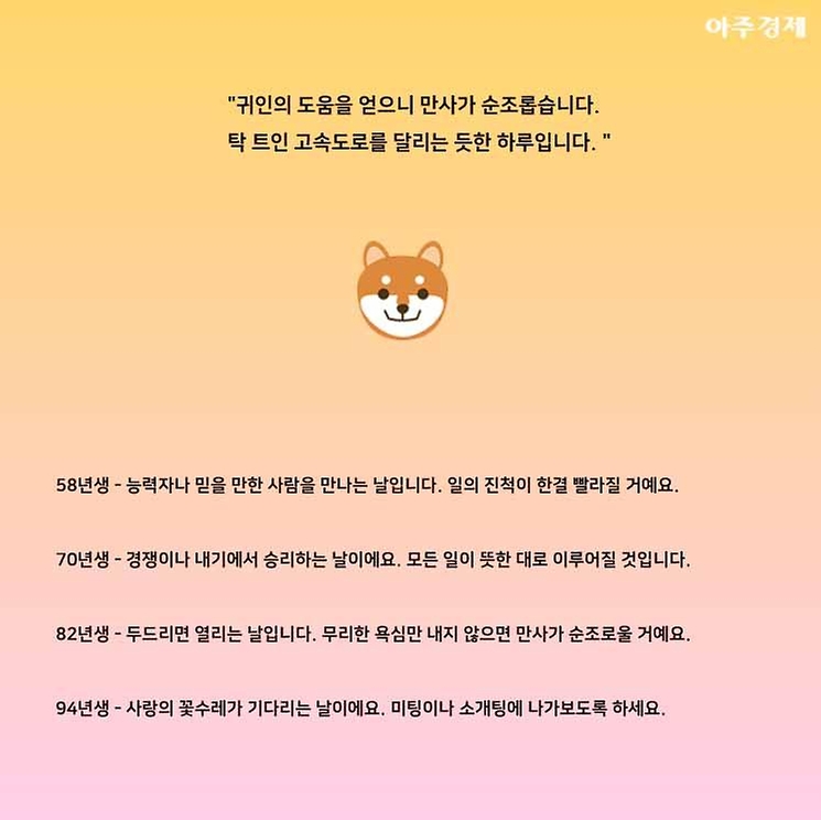 ▶개띠 오늘의 운세 "귀인의 도움을 얻으니 만사가 순조롭습니다. 탁 트인 고속도로를 달리는 듯한 하루입니다. "