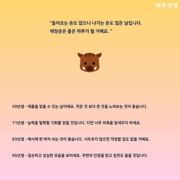 ▶돼지띠 오늘의 운세 "들어오는 돈도 많으나 나가는 돈도 많은 날입니다. 애정운은 좋은 하루가 될 거에요. "