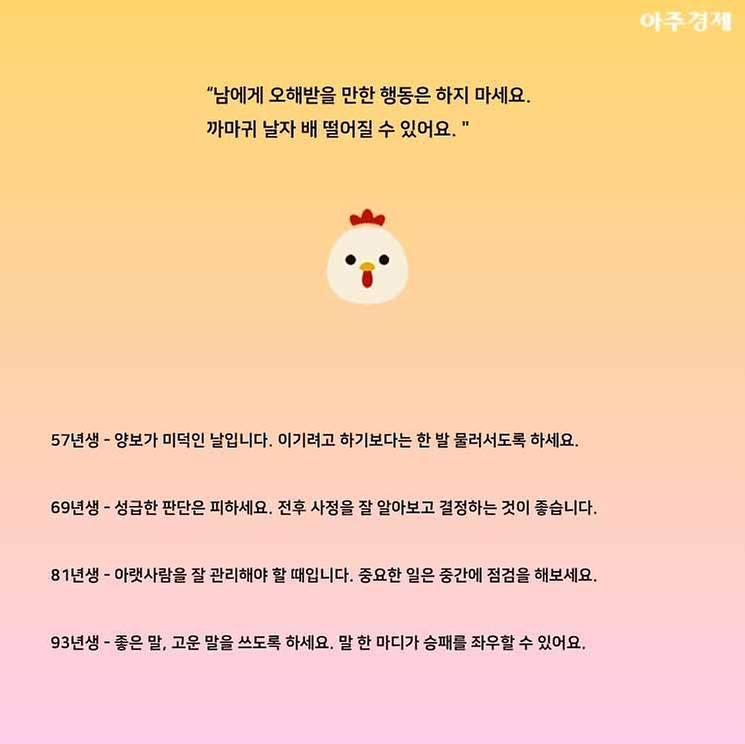 ▶닭띠 오늘의 운세 "남에게 오해받을 만한 행동은 하지 마세요. 까마귀 날자 배 떨어질 수 있어요. "