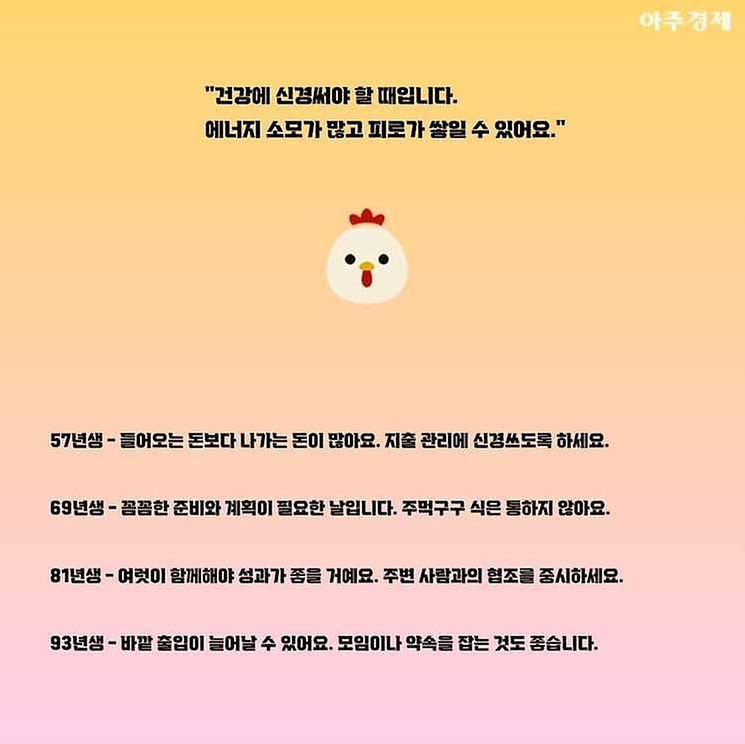 ▶닭띠 오늘의 운세 "건강에 신경써야 할 때입니다. 에너지 소모가 많고 피로가 쌓일 수 있어요."