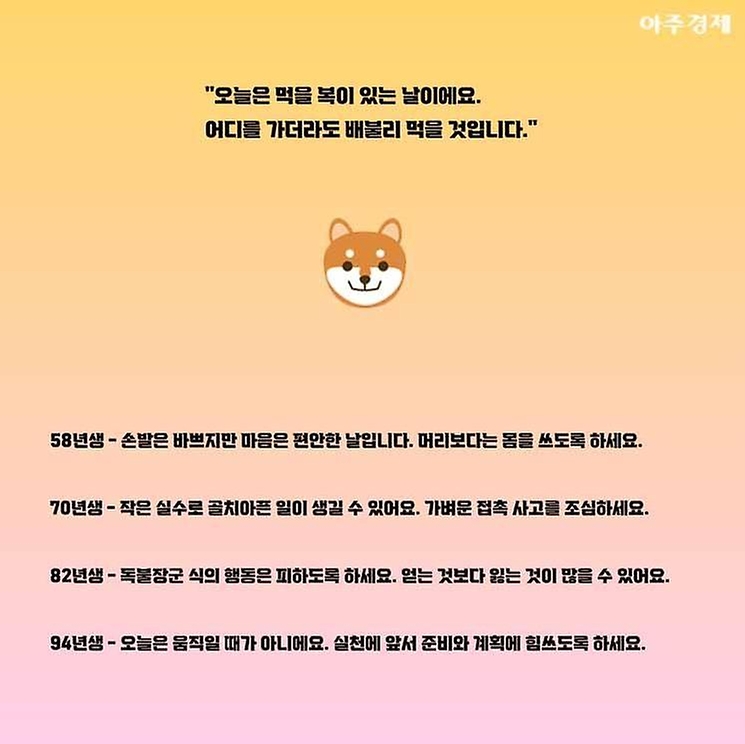 ▶개띠 오늘의 운세 "오늘은 먹을 복이 있는 날이에요. 어디를 가더라도 배불리 먹을 것입니다."