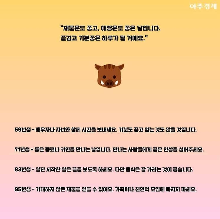 ▶돼지띠 오늘의 운세 "재물운도 좋고, 애정운도 좋은 날입니다. 즐겁고 기분좋은 하루가 될 거예요."