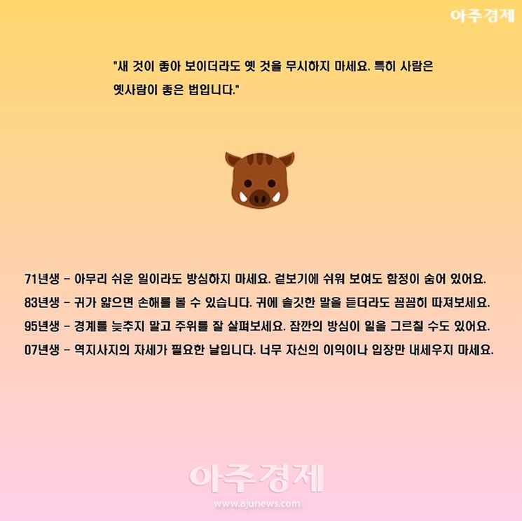 ▶돼지띠 오늘의 운세 "새 것이 좋아 보이더라도 옛 것을 무시하지 마세요. 특히 사람은 옛사람이 좋은 법입니다."