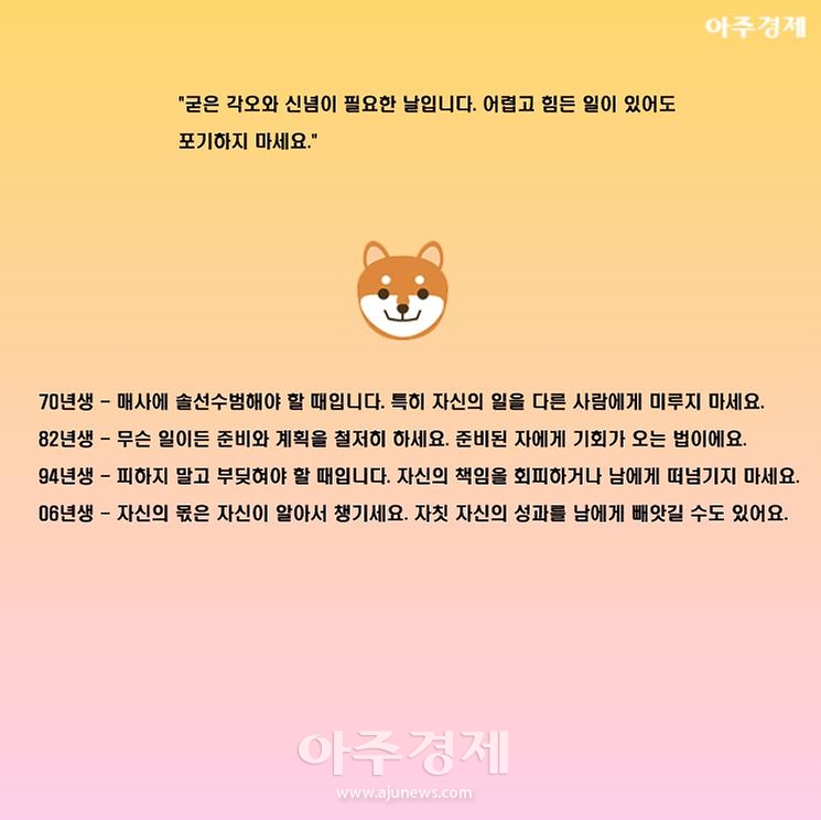 ▶개띠 오늘의 운세 "굳은 각오와 신념이 필요한 날입니다. 어렵고 힘든 일이 있어도 포기하지 마세요."